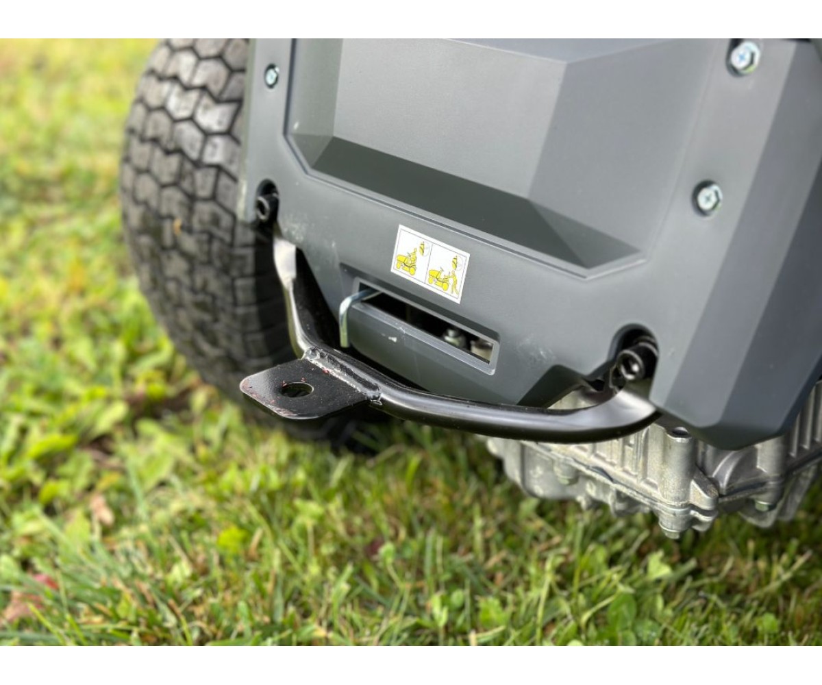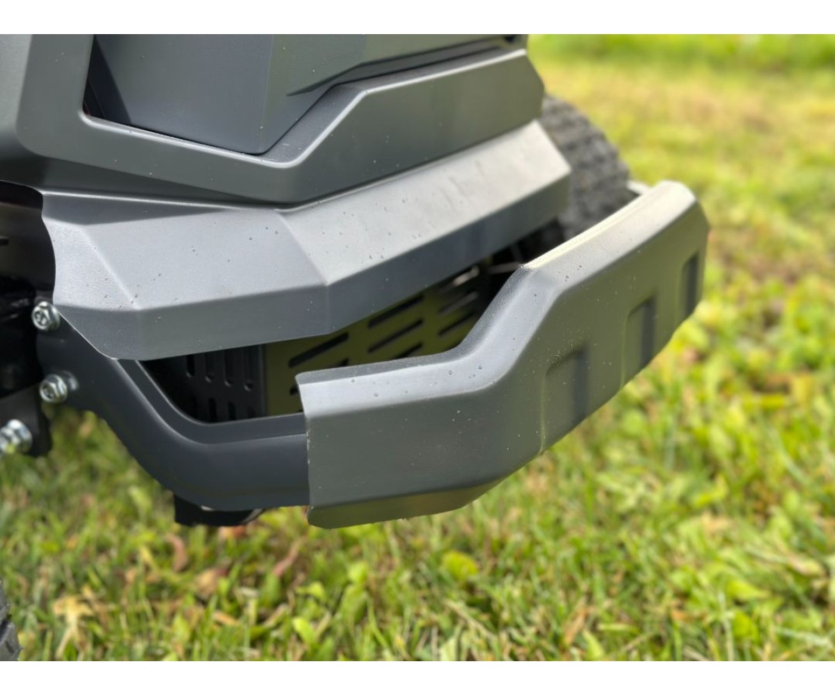 - Передний защитный бампер - предотвратит повреждение трактора при наезде на препятствия. Поворотный передний мост обеспечивает хорошую устойчивость и комфорт во время движения.