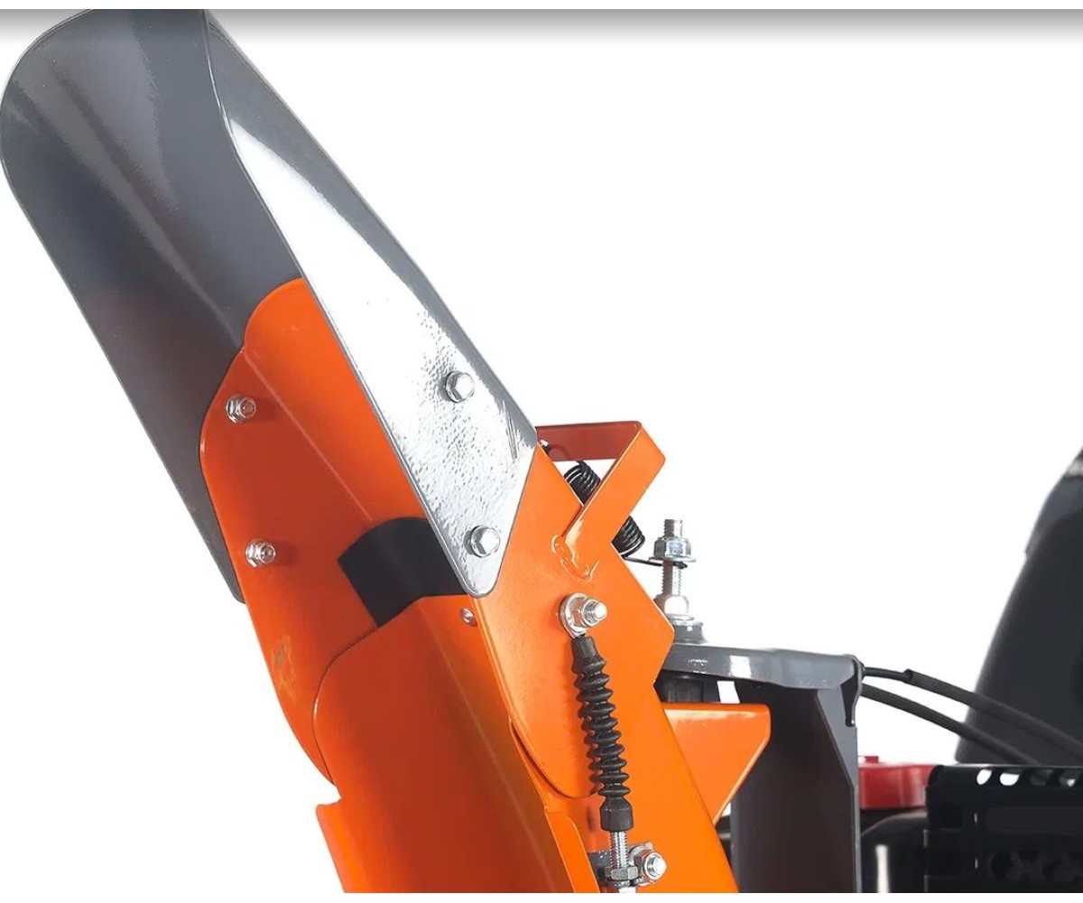 - Труба выброса снега надежно фиксируется на ковше (не болтается), дальность выброса снега регулируется в ручную надежно и поток снега не выбивает желоб выброса вверх, как это происходит на многих китайских аппаратах.