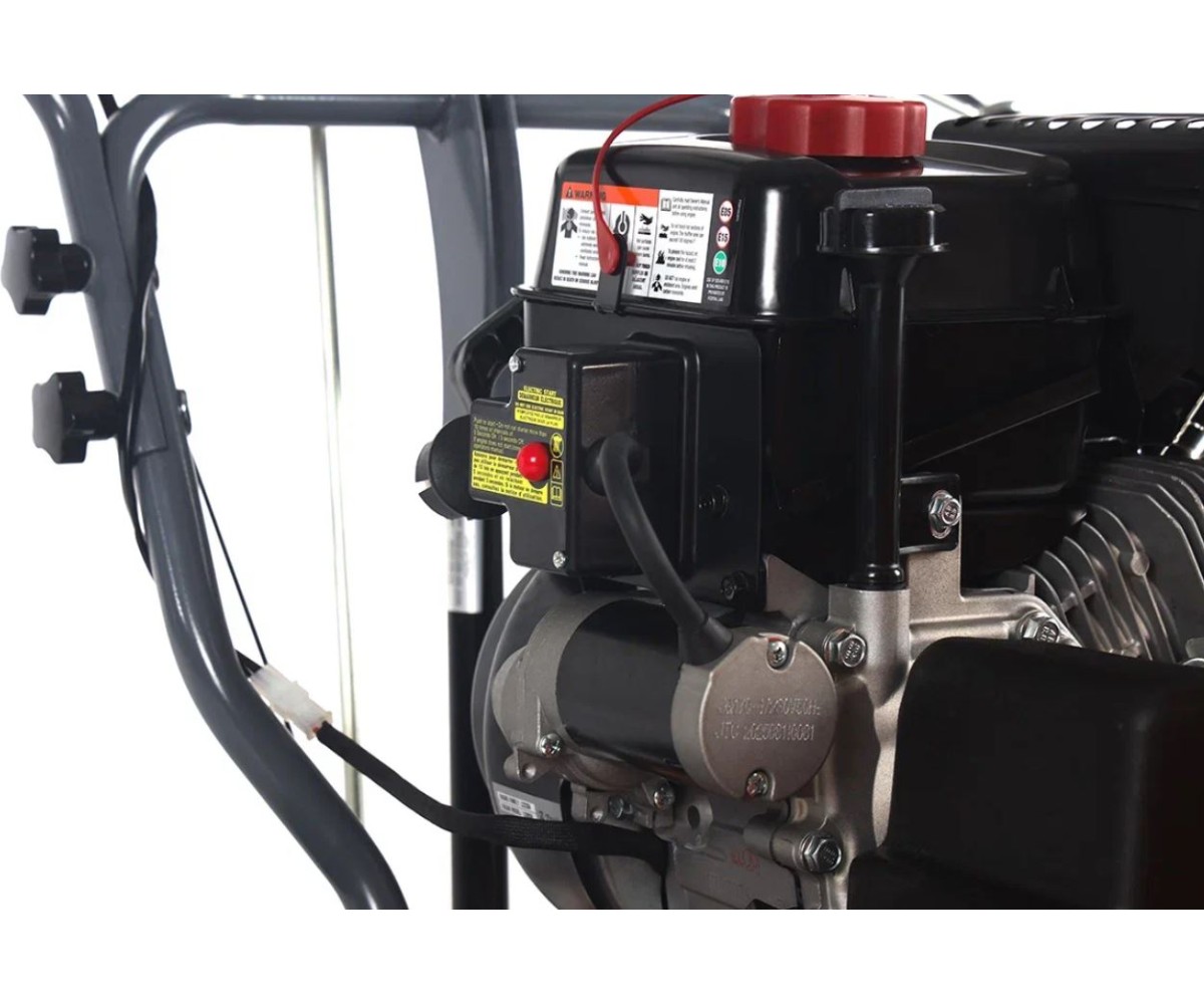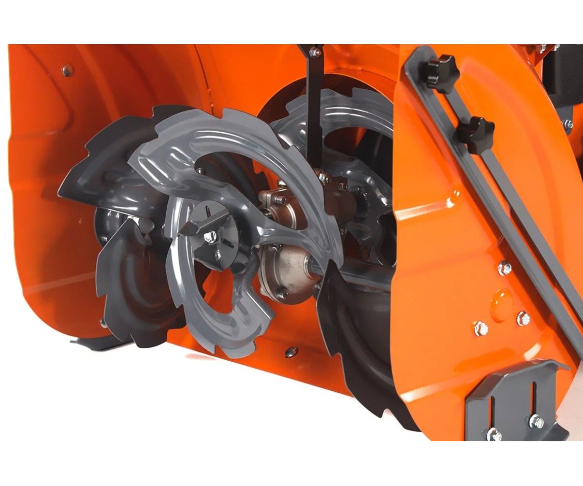 Ширина захвата составляет 610 мм, а высота очищаемого слоя — 585 мм, что позволяет быстро обрабатывать большие площади. Оснащенный трехступенчатой шнековой системой, аппарат не просто сгребает, а эффективно измельчает и перемалывает даже слежавшиеся сугробы и снег с ледяной коркой. Первая ступень (центральный шнек) подбирает и подает снег, вторая (зубья ротора) его дробит, а третья (крыльчатка) выбрасывает через металлическую трубу выброса. Дальность выброса снега достигает 14 метров, что позволяет откидывать массы далеко в сторону, не загромождая проделанный путь. Направление выброса регулируется с удобной панели оператора, а дальность — вручную, обеспечивая точный контроль над процессом.